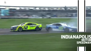 Ryan Blaney retaliates against Suárez after the checkered flag at Indy